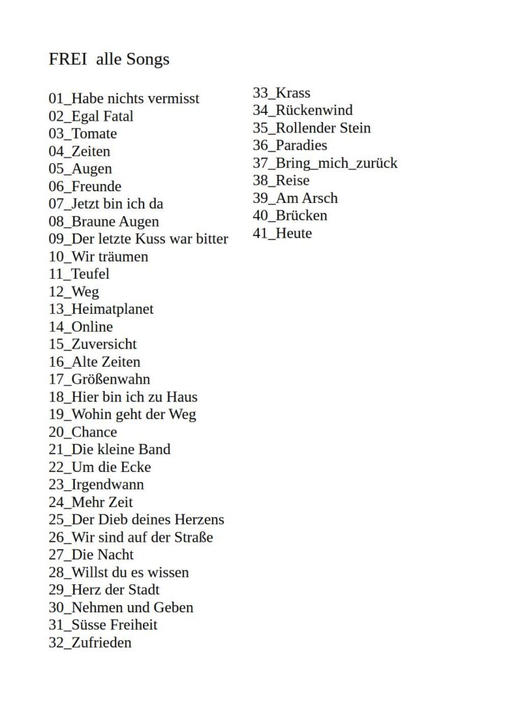 FREI erschafft und präsentiert eigene Lieder. Hier ist unsere aktuelle Setliste: